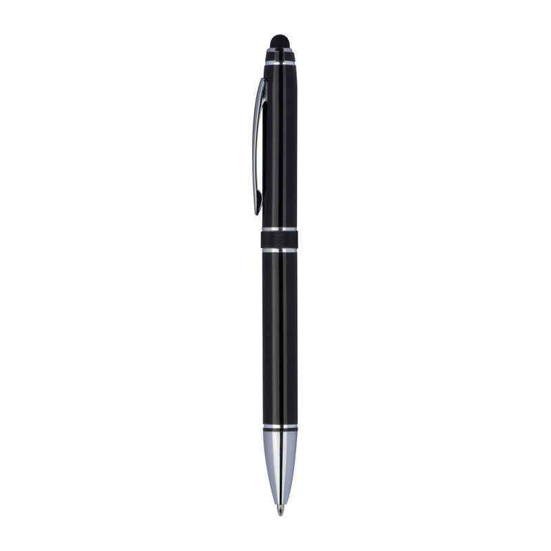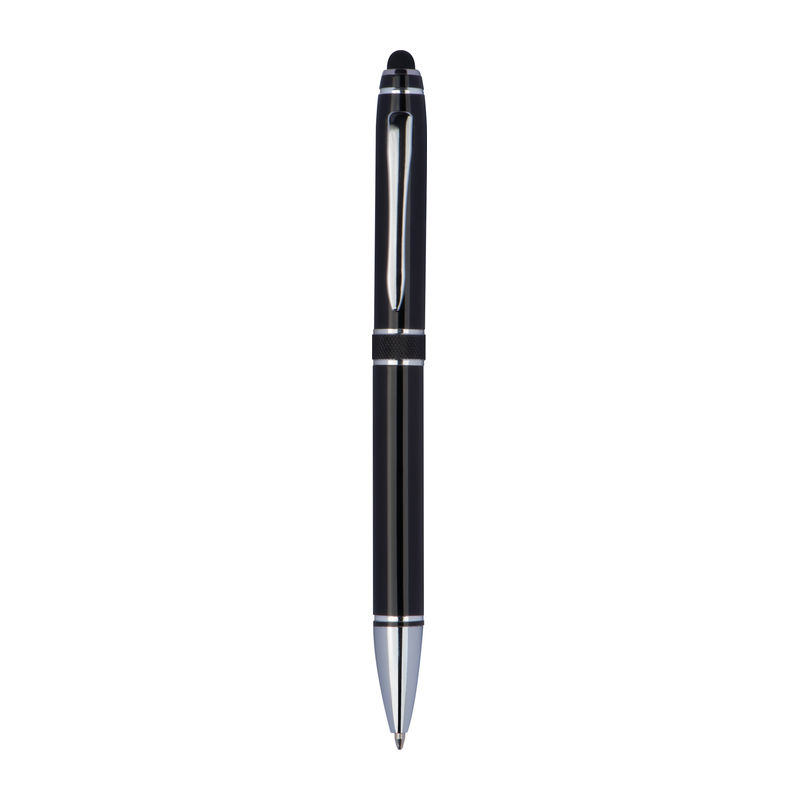 Kovinski kemični svinčniki in pisala, Pisala na dotikVisokokakovosten aluminijast kemični svinčnik na zasuk z modrim pisalnim polnilom, srebrnimi aplikacijami in funkcijo na dotik v okolju prijaznem ohišju. Vaš oglas bo vgraviran na desni strani desno od sponke.