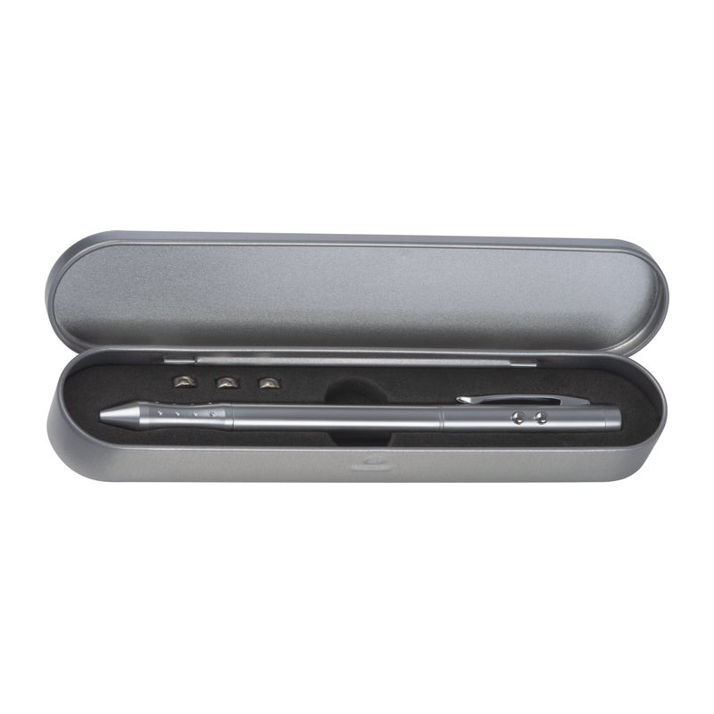 Laserski kazalniki4-v-1 laserski kazalnik s kovinskim kemičnim svinčnikom z rdečim in modrim črnilom, laserskim kazalnikom in LED lučko. Dobavljeno v kovinski škatli in vključuje tri gumbne baterije.