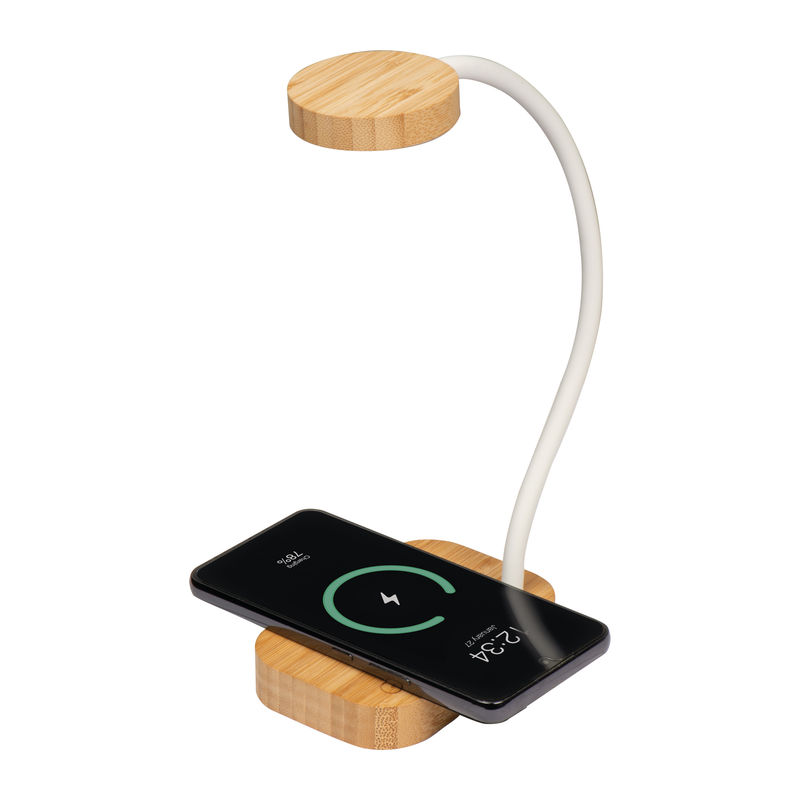 Brezžični polnilci, Namizni pripomočkiVsestranska svetilka, izdelana iz bambusa, s tremi načini osvetlitve: topla svetloba, hladna svetloba in zatemnjena topla svetloba. Integriran indukcijski polnilnik (15W) v bambusovem podstavku omogoča priročno polnjenje vseh pametnih telefonov, združljivih z indukcijo. Vsaka enota